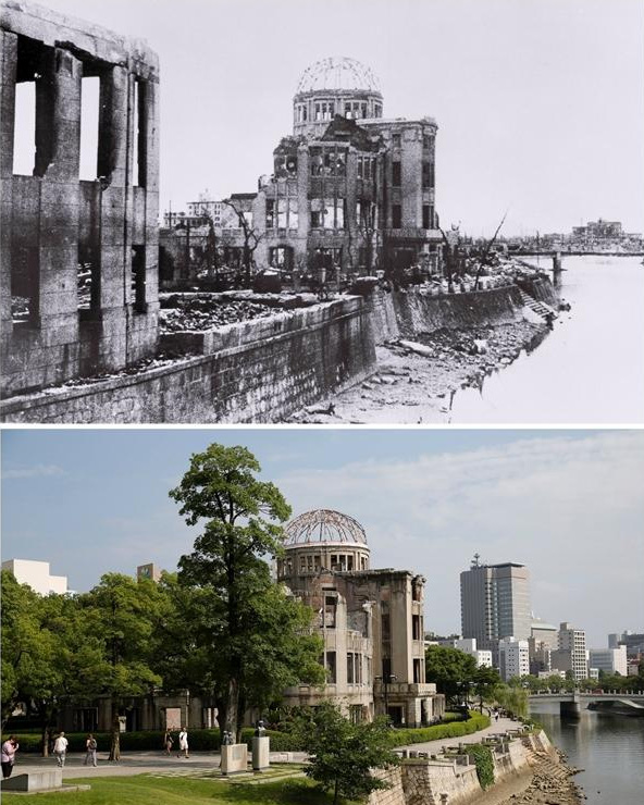上图为1945年的广岛县产业奖励馆,被原子弹轰炸后的第14天,Masami Oki拍下了这张照片,下图为2015年7月28日,在同一个位置拍下的照片,在广岛和平纪念馆内展出。
