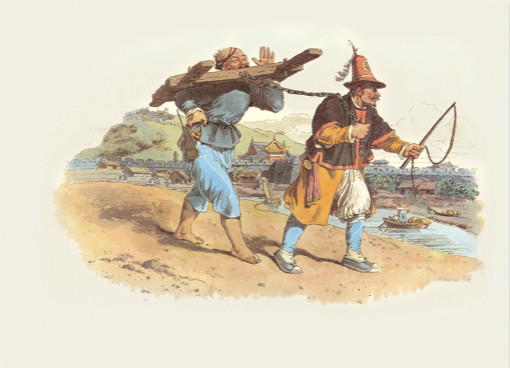 威廉•亚历山大(William Alexander,1767—1816):生于英国肯特郡,1784年进入皇家美术学院绘画专业学习。1792年作为马戛尔尼使团画家托马斯•希基的助手访问了中国,创作大量的速写和水彩画。枷刑:此图所描绘的是戴着木枷的刑罚。这种刑罚和我们的颈手枷差不多,只是在中国,一个犯了轻微罪行的人,脖子上就会戴上一大块木板,有时几个星期,甚至几个月,有时连同两只手都会被卡在木板的小洞里。图中的犯人所受之刑不是最常见的刑罚,所受之苦远远低于压在人肩膀上的大木枷的压迫,此人只是人身自由受到限制。犯人的罪名一般写在木枷的边缘上,有时也会写在与木枷相连的牌子上。/n