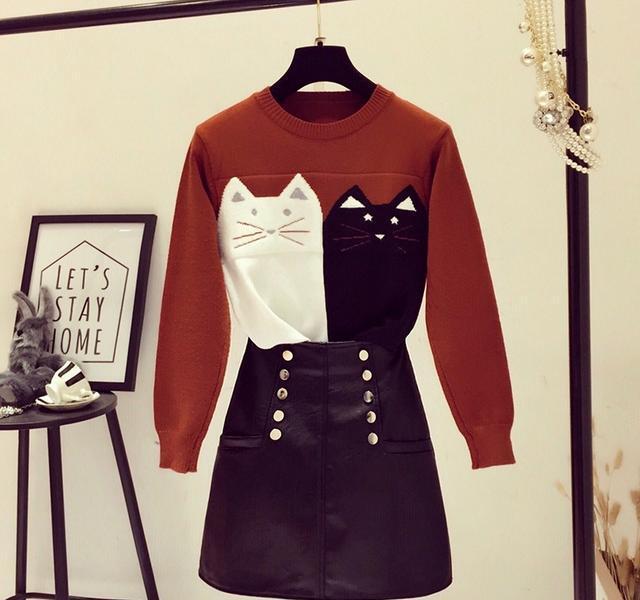 可爱猫咪毛衣+PU皮半身裙两件套,简约时尚的撞色针织衫,保暖又百搭,搭配时尚半身裙,时髦显个性,十足小资女人味。