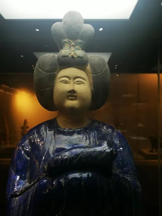 ▽“三彩挂蓝,价值连连"。这件大到没朋友的三彩肥婆不仅挂蓝,挂的还是现代才有洋蓝,比圆珠笔涂的还蓝。那张柿饼脸,那双斗鸡眼,也大大突破了唐代审美的下限。真是神仙放屁,不同凡响。