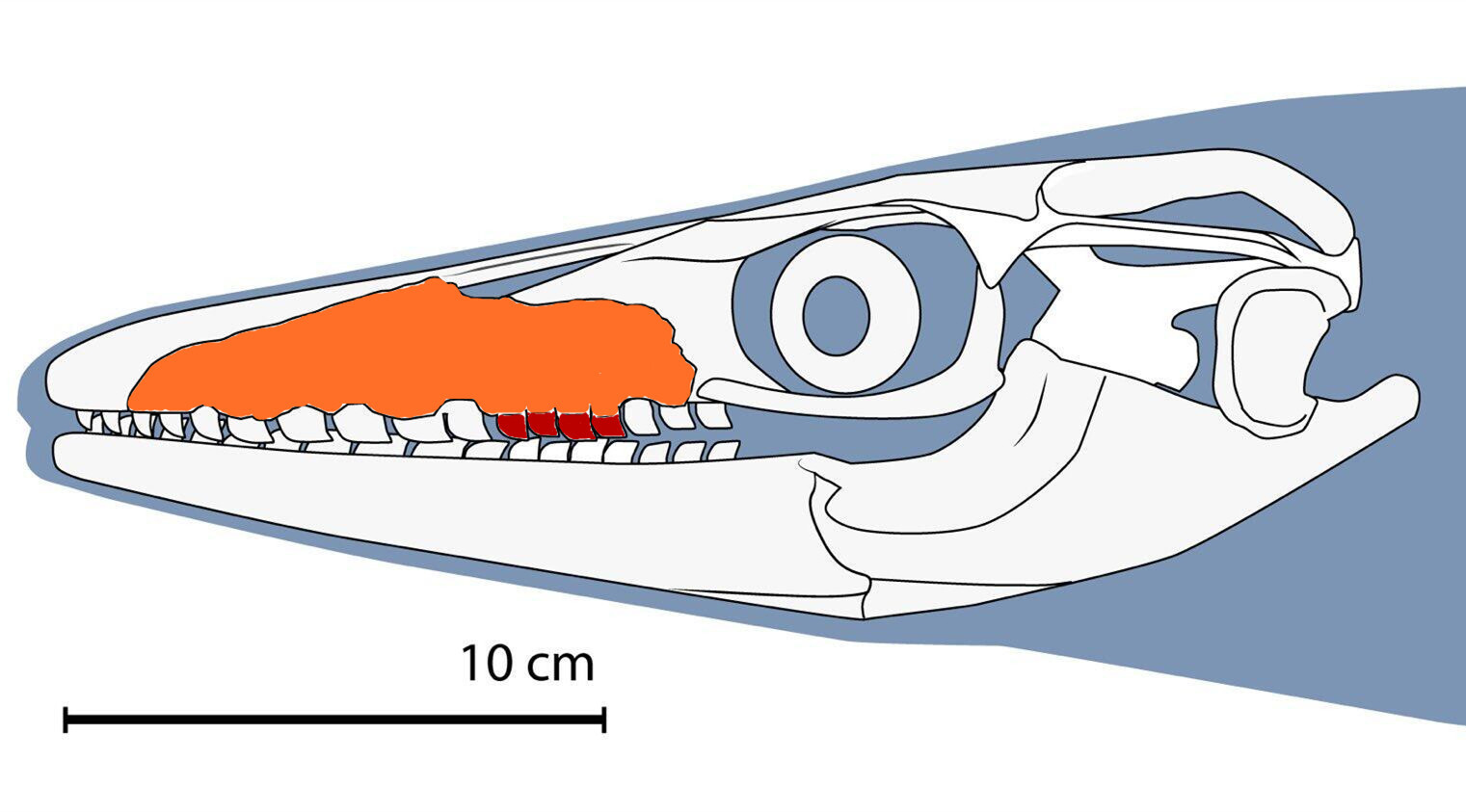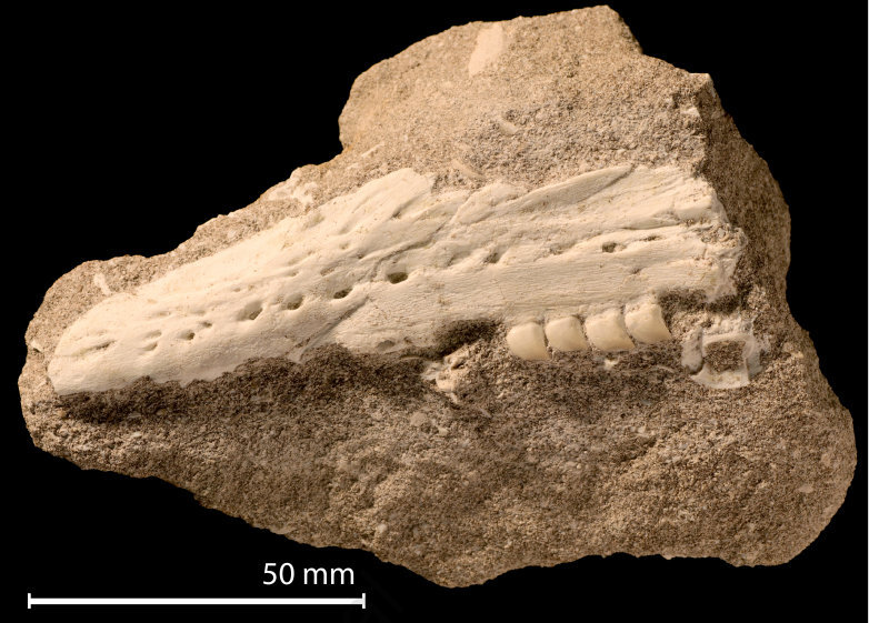 不久之前,古生物学家在西迪琴南的磷酸盐矿区中发现了一块十厘米长的化石碎片。从外形上看,化石很显然属于沧龙类的上颌骨,但是依然连接在上颌骨上的几颗牙齿非常特别,是之前从来没有见过的,这吸引了来自多个国家的古生物学家共同研究。