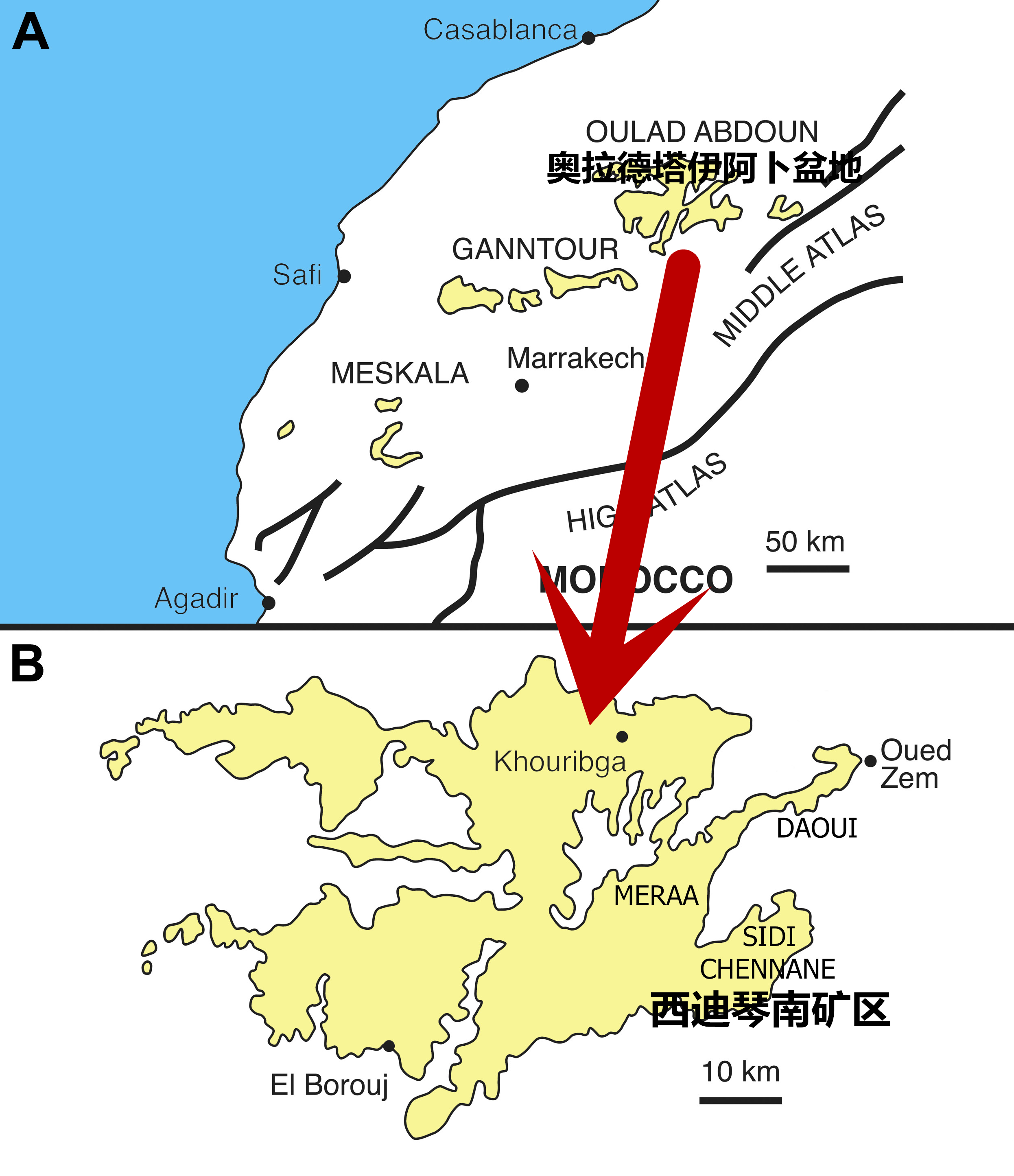 摩洛哥位于非洲西北部,国土大部分都是荒芜的沙漠戈壁,看似贫瘠的土壤中其实富含磷酸盐,磷酸盐的开采和出口成了摩洛哥的支柱产业。在摩洛哥奥拉德塔伊阿卜盆地(Oulad Abdoun)中分布着多个磷酸盐矿区,其中就包括了西迪琴南(Sidi Chennane)矿区。