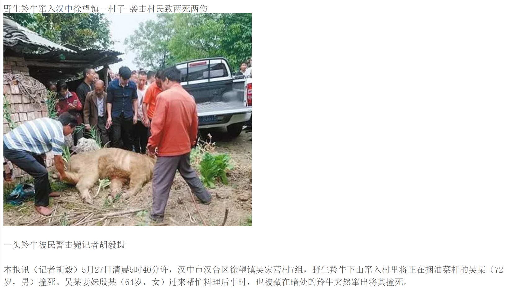 就拿生活在秦岭的羚牛秦岭亚种来说吧,尽管与金丝猴、大熊猫和朱鹮并列为“秦岭四宝”,但是羚牛还被称为“秦岭头号凶兽”。根据统计,在1999年至2008年的十年间,仅仅是在秦岭山区就发生了155起羚牛伤人事件,共造成184人受伤,22人死亡!最近的一次羚牛伤人事件发生在2019年5月,一只羚牛闯入汉中市汉台区徐望镇的一座村庄,造成了2死2伤的惨剧。