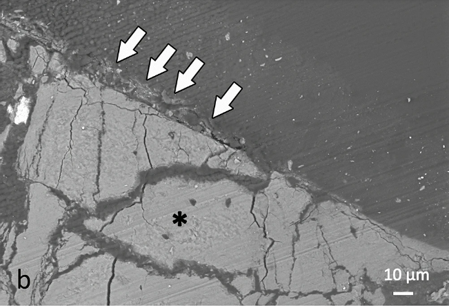 论文重点描述、研究并探讨了位于“大约翰”头盾右侧的钥匙形开孔,这明显是一处创伤结构。研究人员先是采集了开孔边缘的化石样本,经过电子显微镜的观察,发现这部分骨组织较为多孔,有更多血管,明显是新生长出来的,也就是说孔洞正在愈合。在愈合的同时,孔洞周围又出现了斑块状的骨质沉积,这种沉积则是伤口感染导致的炎症造成的,所以这个开孔伤口曾经导致了发炎。