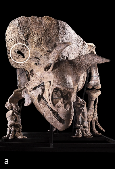 前面一直在介绍“大约翰”头盾上伤口的情况,那么这个伤口是怎么形成的呢?大家第一个想到的就是霸王龙咬的。霸王龙的尖牙利齿的确能够咬穿三角龙骨质的头盾,但是其牙齿与开孔外形明显不符,所以霸王龙并非凶手。