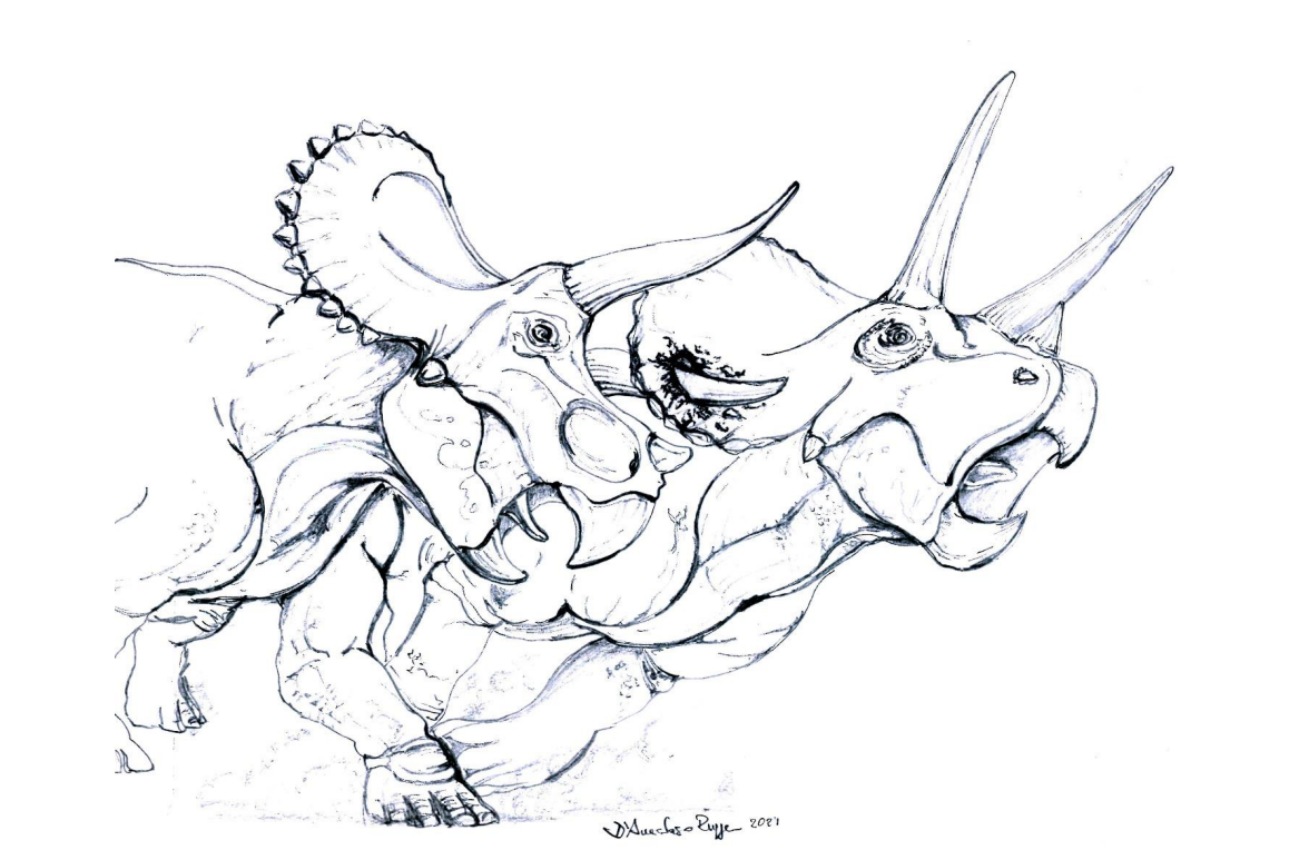 如果不是霸王龙干的,那么最可能的凶手就是同类啦。作为一种好斗的恐龙,三角龙之间经常会爆发激烈冲突,三角龙会脑袋对脑袋,大角交叉抵在一起决斗,如此重量级的决斗很容易留下伤口。当研究人员研究“大约翰”头盾上的开孔时却发现正常决斗是不可能造成这种的伤口的,除非是同类从后方偷袭,用长角戳破了“大约翰”的头盾,真的是不讲武德啊!!!