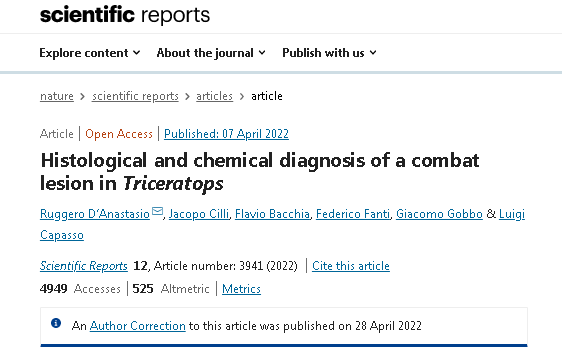 正当大家因为“大约翰”被私人收藏,可能无缘于科学研究和公开展示而惋惜的时候,一篇关于“大约翰”的研究论文发表在最近出版的《科学报告》上,论文名为《三角龙战斗损伤的骨组织学和化学诊断》(Histological and chemical diagnosis of a combat lesion in Triceratops)。