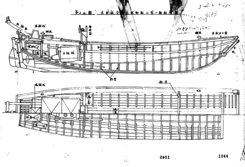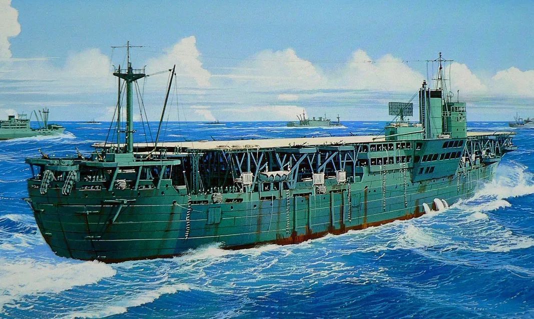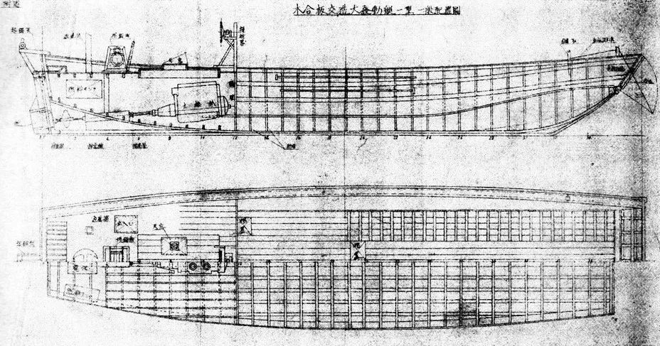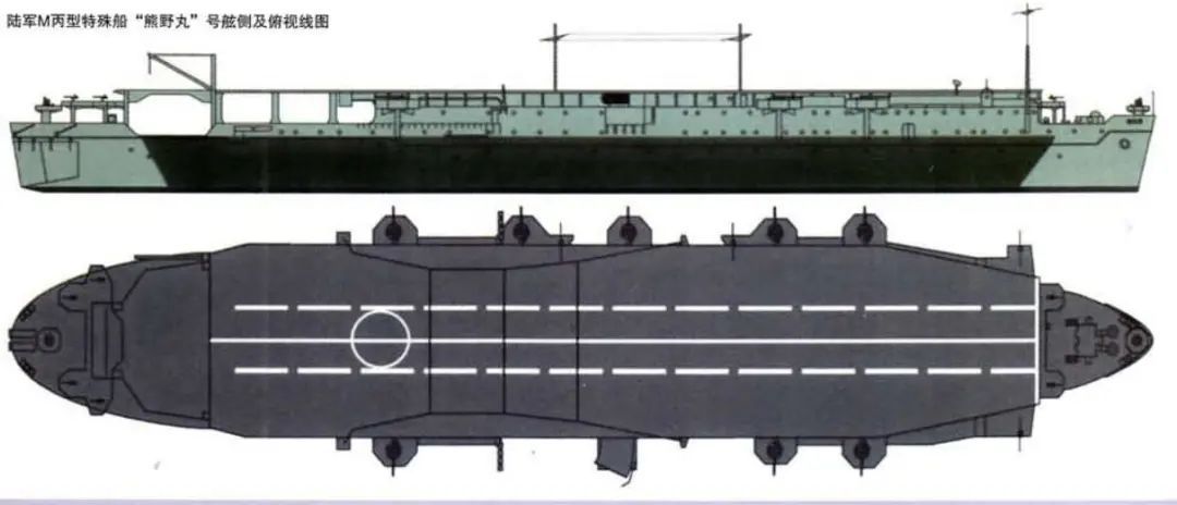在最小的(5656吨)运输船“高津丸”上,大型发动艇被放在上层甲板上,只有在起重机的帮助下才能下降。最后,在1945年春天开始服役的“熊野丸”号航空母舰上,大发动艇和飞机一起被存放在机库里,只有在起重机的帮助下才能下水。
