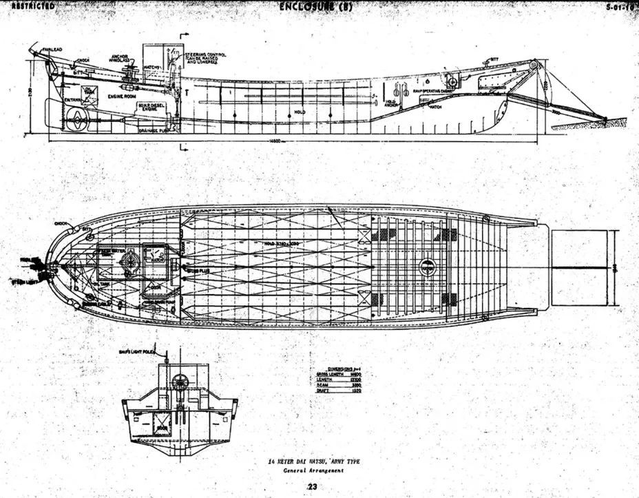 海军开始使用大发动艇的时间比陆军晚。如上所述,到战争开始时,即使是专门改装为其载体的登陆舰也还没有拿到专用的运输艇。舰队的辅助运输船当然也没有拿到运输艇。例如,“安昙山丸”号在1942年1月24日的作战中才收到三艘大发动艇,当时她确保了在拉包尔的登陆行动。在1942年5月3-4日,“安昙山丸”号在图拉吉登陆时使用了这些大发动艇。