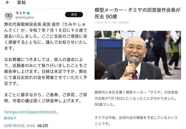 田宫俊作是田宫公司创始人田宫义雄的儿子,公司从木质模型转为塑胶模型,并发展出相关的耗材、工具等周边产业,进而成为许多模友心目中的世界拼装模型龙头老大,他可以说是最为重要的人物,为业界树立了标杆。他离世的消息,自然会在广大模友当中引起不小的反响。
