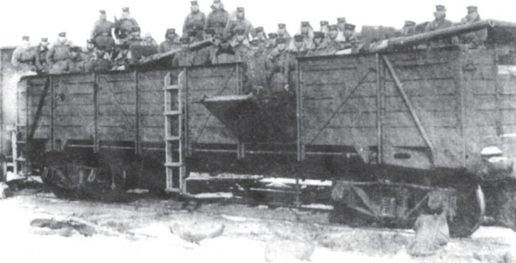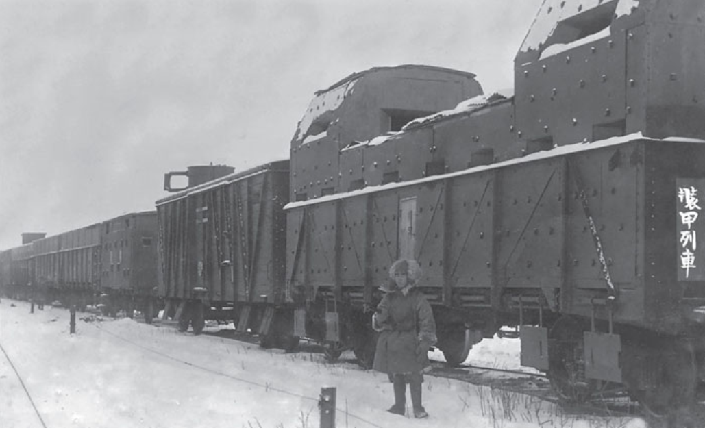 1918年日军出兵西伯利亚期间,利用缴获的俄国火车车厢临时改造的装甲车厢。