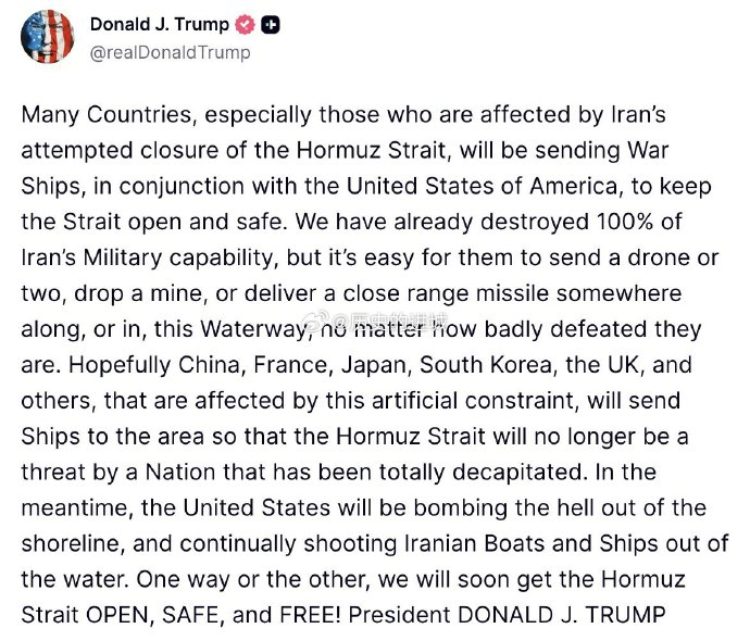 针对霍尔木兹海峡封锁,特朗普14日先是称美军将“非常快”地开始护送油轮,并正向中东增派5000名海军陆战队员及两栖攻击舰,应该就是前面决定派出两栖打击群的消息。然后最近又表示美国将与许多国家”合作,派遣军舰前往霍尔木兹海峡,以保持其“开放和安全”。他还呼吁中国、法国、日本、韩国、英国及其他国家派遣军舰前往霍尔木兹海峡。
